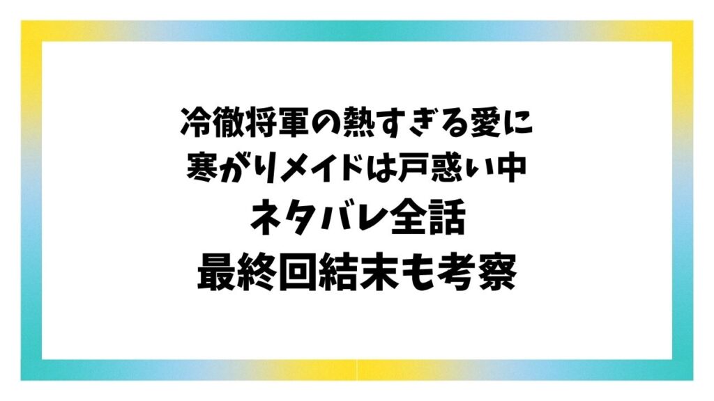 この記事は、 冷徹将軍の熱すぎる愛に寒がりメイドは戸惑い中ネタバレ全話!原作の最終回結末はどんなラストになる? についてご紹介いたいます。 冷徹将軍の熱すぎる愛に寒がりメイドは戸惑い中は、コミックシーモアやめっちゃコミックで配信中の漫画です... -